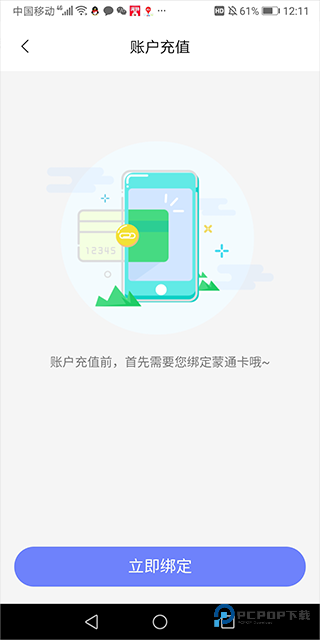 3、激活成功后,返回APP首页,点击【账户充值】,在跳转的页面中绑定蒙通卡,绑定完成后即可进行充值操作。