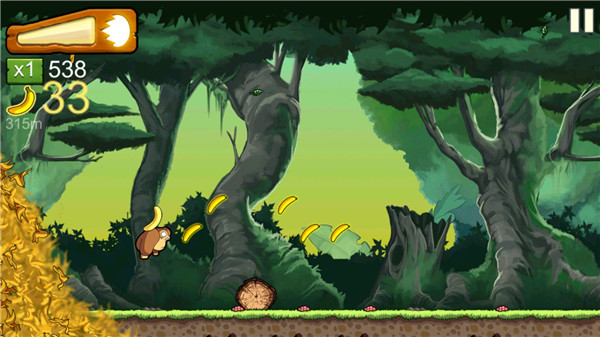 在香蕉金刚游戏中玩家不但要避免被身后的香蕉皮大军淹没,还要躲避逃亡道路上的种种障碍,木球、石柱、水潭等等,要想顺利的躲避这一切,将这场逃亡之路行的更长更远就要看玩家的反应与操控了,玩家的游戏乐趣体验也因为花样繁多的逃跑方式进一步得到提升。值得一提的是游戏中大猩猩无论是跑步的动作还是撞墙时的神态都非常的憨厚,而随机多变的关卡也增加了游戏的新鲜感,让玩家永远不会觉得厌倦,而且每次游戏都是一次新的挑战,因为每个层级的游戏都是随机的。此外,香蕉金刚最新版游戏中玩家还可以收集尽可能多的香蕉来补充你的能量条,使用能量冲击波摧毁障碍,或选择地下深洞区或树梢等替代路线,寻找秘密和解锁附加层级,探索更多的游戏乐趣,感兴趣的小伙伴快来下载体验一下吧。