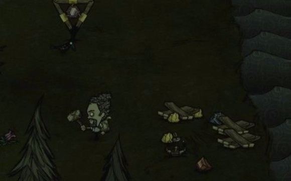2.一开始要做的第一件事搜集附近的浆果、萝卜和燧石,这三项在道具栏最少要保持3个的数量。然后在将浆果萝卜可以吸引兔子或自己食用,燧石则是初期有限的资源,伐木采矿的工具都需要先做出来。再来将树枝、草、木材之类的工具营火必须道具收集满一组,就可以准备大范围探索了!刚开始的夜晚都很短,木头营火勉强可以烧整晚,但最好要等完全入夜之后再生火避免浪费资源。