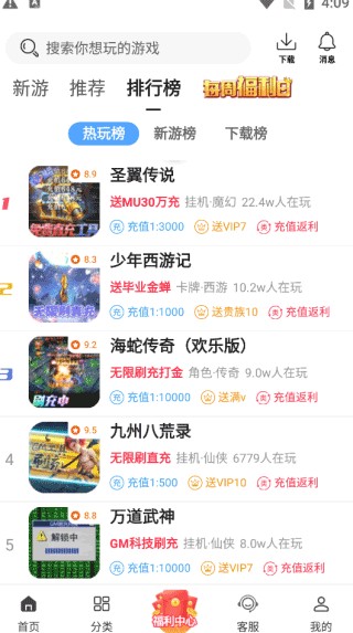 3、上千款福利游戏,上线后提供免费V、钻石和金币。手游玩家的天堂,只做公益,只求满足,带给你手游的快感。