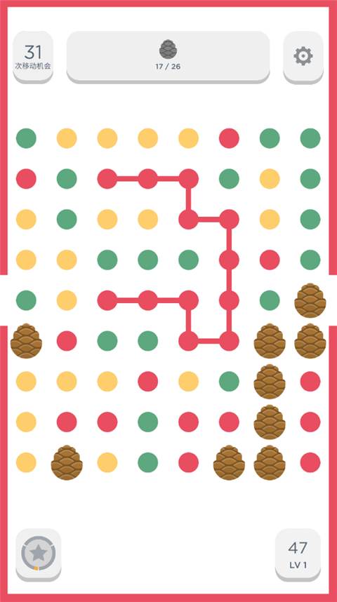 2、你将通过连线相同颜色的点进行消除,不能直角连接