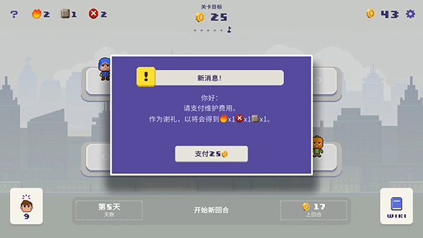 2、游戏中是以天数为进度的,消息提示我们需要在5天后支付25金币的维护费用,点击【了解】即可继续,