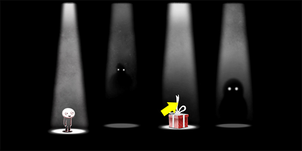 3、往右边走,在一众黑白的世界中,我们能很明显地看到一个色彩鲜艳的礼物盒