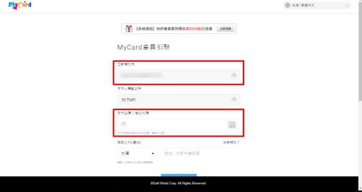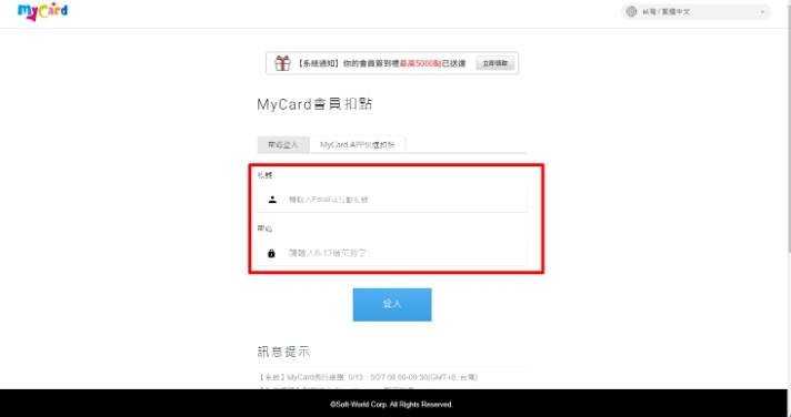 Set2:填写您MyCard的帐号及密码后登入,即将进入MyCard会员扣点流程。