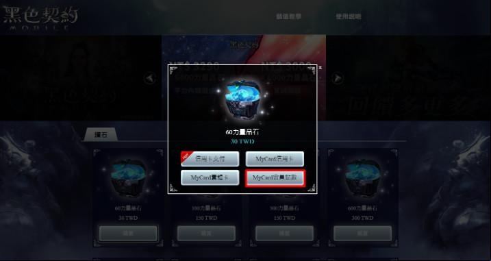Set1:在官网的上方功能列表中 ,点选「储值商店」,在欲购买数量的力量晶石之付费方式,选择「MyCard会员点数」