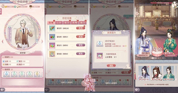 每个随从都有四种属性,其中有一项作为特长,特长在很多玩法中都起到了关键作用。随从的属性可以通过吃书、吃加成道具、累计忠诚度、升级知己技能以及特定随从的光环进行加成。随从的忠诚度可以通过寻访和宫务提高。若是小主得到了带有光环的随从,那么相同属性的随从也可以得到相应的属性提升喔!