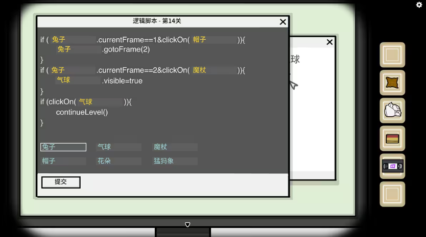 clickOn()判断玩家按了哪个物体,按照流程首先按的是帽子,然后是魔杖,最后按的是气球