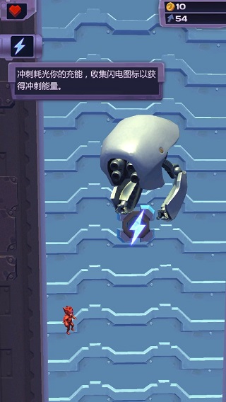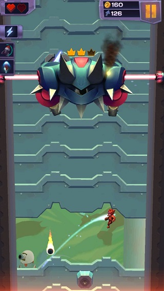 既然这是一款不断向上的游戏,那么自然有导致主角死亡而结束的东西,其中一个是从初始状态开始一直往上爬的红外激光,另一个就是所谓的人工智能了。虽然长得丑了点,但在这个游戏世界中,就是他们通知了人类,让人类不得不躲到地底下的。主角拥有两种战斗能力,一种是一段时间后自动发射的跟踪导弹,能够一次干掉一个人工智能,另一种则是在有能量时向上滑动,此时会在主角的身体外围出现一个护罩,这时候的主角就处于无敌状态。同时,在游戏过程中会出现能够落脚的跳台,主角落在上面会获得一个快速向上冲刺的效果,并且身上出现护罩,并保持一段时间。