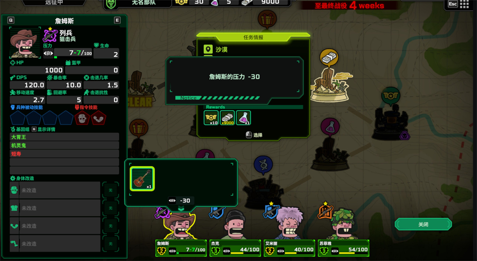 局外也有一些较为轻度的养成系统,例如选择不同种类的士兵组成四人远征队;点满科技树以强化医疗车和无人机的性能,或扩充支援设备槽等。