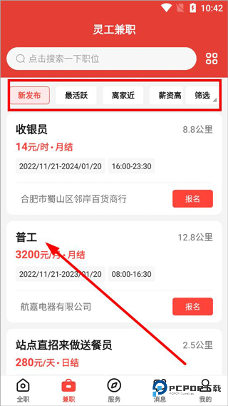 3、切换至兼职版块,可搜索并筛选合适的兼职岗位,详细查看兼职相关信息;