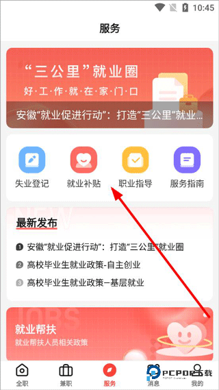 4、打开服务版块,可办理失业登记、查询就业补贴,了解最新就业相关政策;