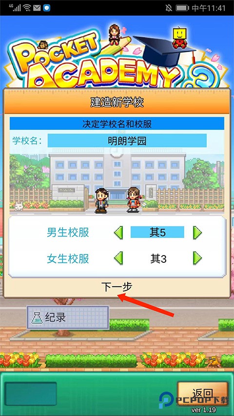 2、开始创建新学校,输入学校名称、设定好男生与女生的校服样式后,选择【下一步】选项;