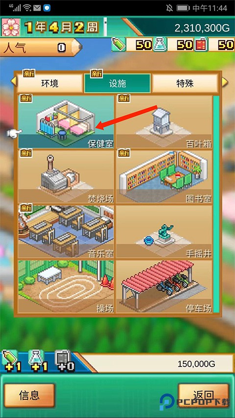 7、进入【设施】界面,包含保健室、百叶箱、图书馆、音乐室、操场等多种建筑,本次以建造【保健室】为例;