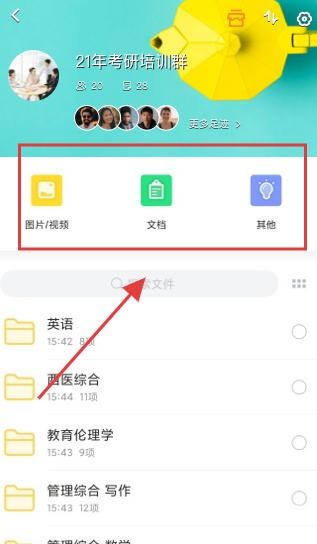 2、曲奇云盘群组详情页,21年考研培训群提供图片,视频、文档、其他分类入口,便于用户按类型筛选群内文件,高效查找所需资料。