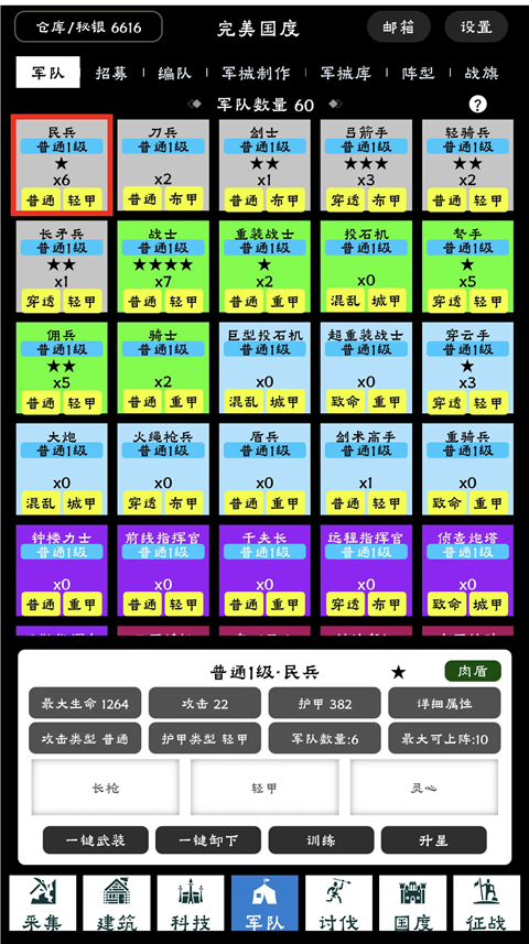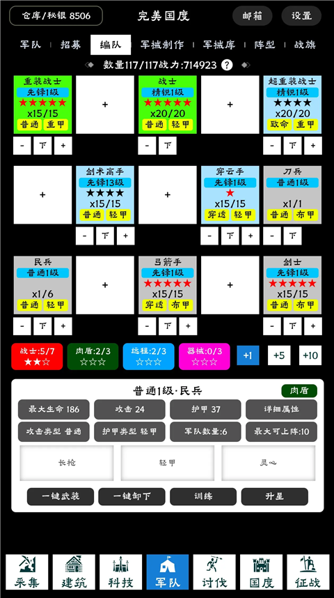 完美国度手游还引入国战玩法,玩家解锁了剑士、弓箭手、长矛兵等各种兵种后,就可以指挥不同兵种进行国家掠夺,抢占资源。游戏采用点击式玩法,玩家只需点击对应资源、设施方块以建造生产,操作简单,快在完美国度中开启你无尽掠夺的时代。