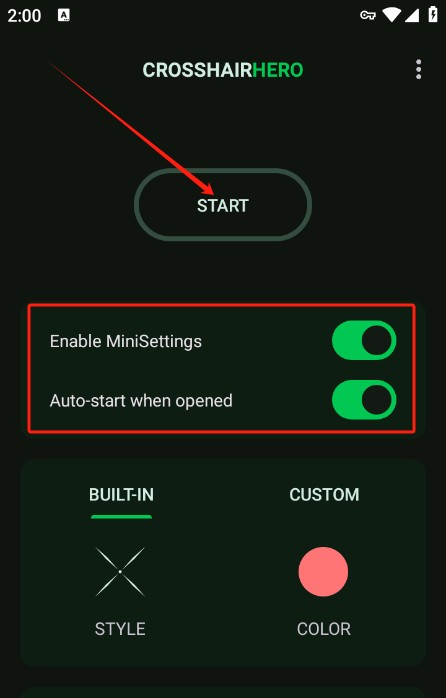 3、打开Enable MiniSettings和Auto-start when opened,点击START启用准星。