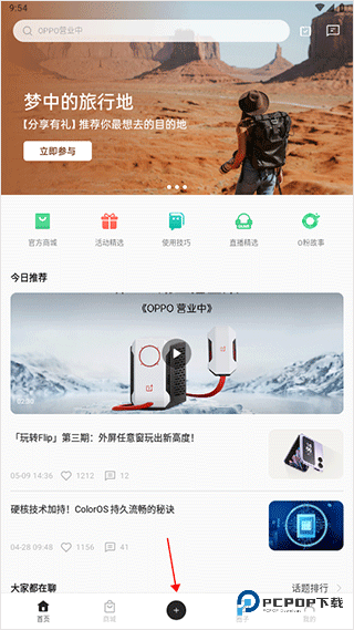 1、进入OPPO社区首页,点击页面底部正中间的“+”号图标;