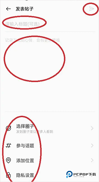 3、按提示依次填写帖子标题、输入帖子内容、选择所属圈子、添加相关话题,完成后点击发送图标即可发布。