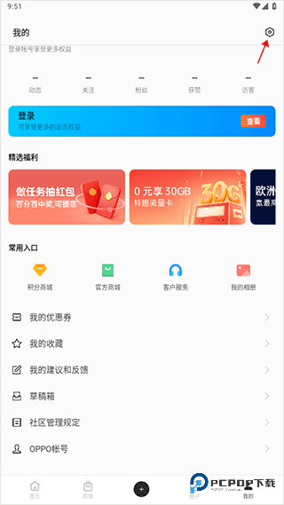 1、打开OPPO社区,进入“我的”页面,点击右上角的设置图标;