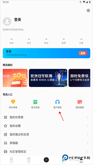 1、进入OPPO社区“我的”页面,选择“客户服务”选项;