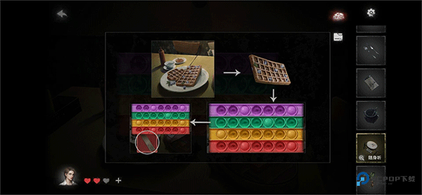 进入第一个房间,内有两张桌子,其中一个男孩会拿走你的书籍;另一张桌子上有个小游戏,线索藏在旁边的饼干上,按照饼干上的凸起点亮珠子,可获得1块木块拼图和一个临时无法解开的物品(建议参考视频攻略),同时得到1颗钻石糖;