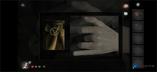 点击恶魔画像右侧的柜子,里面有2个雕塑,随机点击后会获得1张纸条;