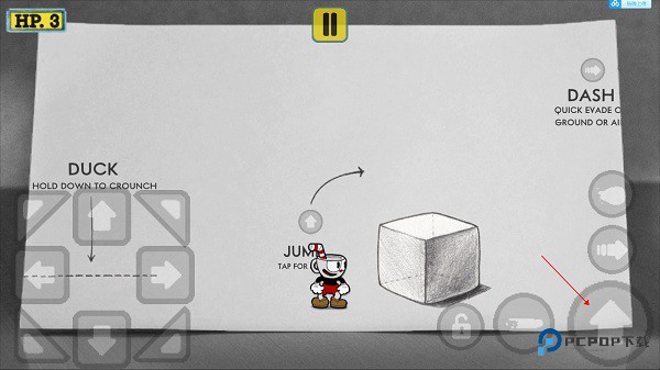 1、左下角带有颜色的区域为下蹲键,面对部分敌人攻击时,可通过下蹲躲避伤害;