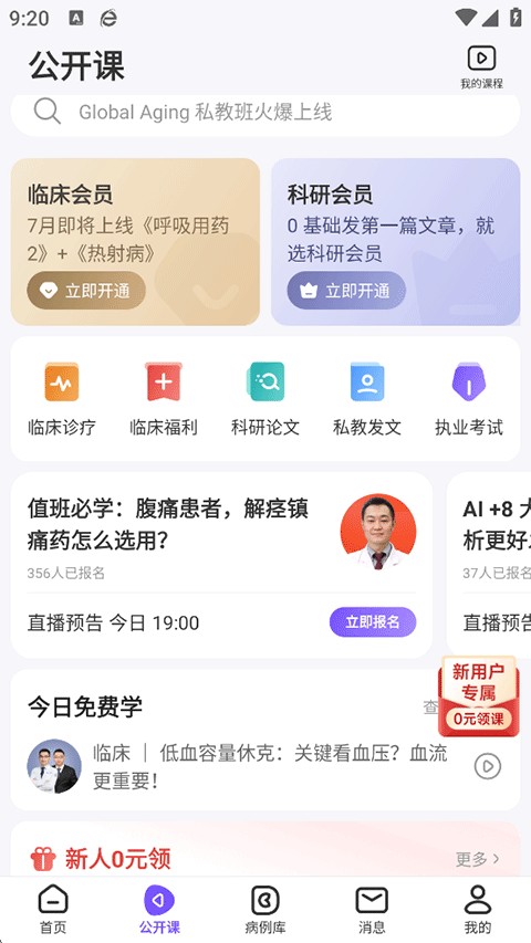 2、在公开课页面包含了众多如临床诊疗、科研论文、执业考试等课程学习资源;