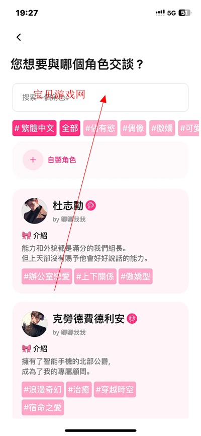 进入首页,可以搜索框输入关键词,直接检索角色进行对话