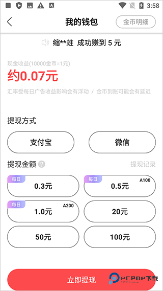 4、待金币积累至提现门槛后,即可进入收益页面,将金币兑换为现金,申请提现至支付宝或微信个人账户,审核通过后快速到账