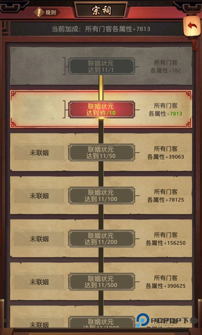 培养子嗣不仅可以增加势力,还可以通过联姻解锁宗祠加成提升所有门客属性。而解锁宗祠加成需要大量不同身份的子嗣联姻。
