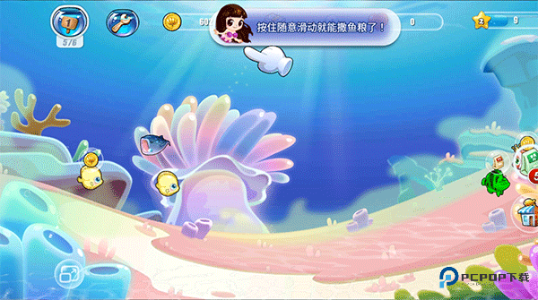便捷喂食操作方法:整体喂食流程简单易上手,无需复杂操作,只需要点击界面中的粮食袋,再通过手指在屏幕上滑动,就能均匀撒下鱼粮,轻松完成喂食步骤,新手也能快速熟练操作。