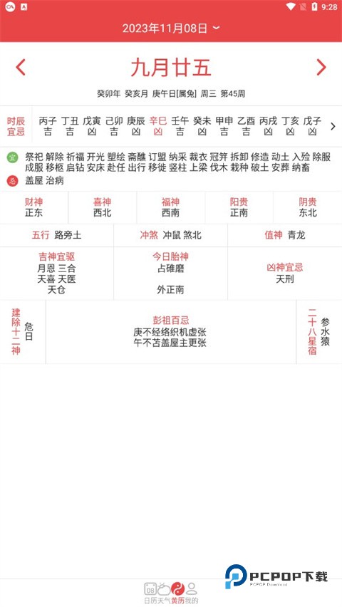 3、黄历: 包括:二十四节气、吉凶宜忌、冲煞、合害、纳音、干支、十二神、值日、胎神、星宿、月相、吉神凶煞、彭祖百忌、六曜、九星、流年、太岁、三元九运、玄空九星、星期、生肖、方位等等。
