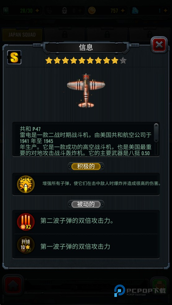 主动技能:增强飞机,现在飞机会射得更快更强。