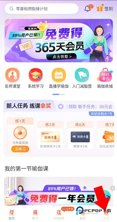 1、在本站下载并安装每日瑜伽,来到主界面后,点击右下角的个人选项