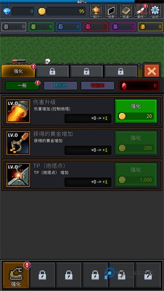 2、当我们有一定的金币之后,就可以去强化伤害和黄金的增加,以及炮塔点的增加;