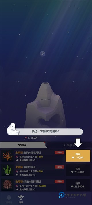 2、购买 “柔软的枝杈珊瑚”,它能提升每秒生命力产量并增加鱼的数量上限,助力水族馆成长。