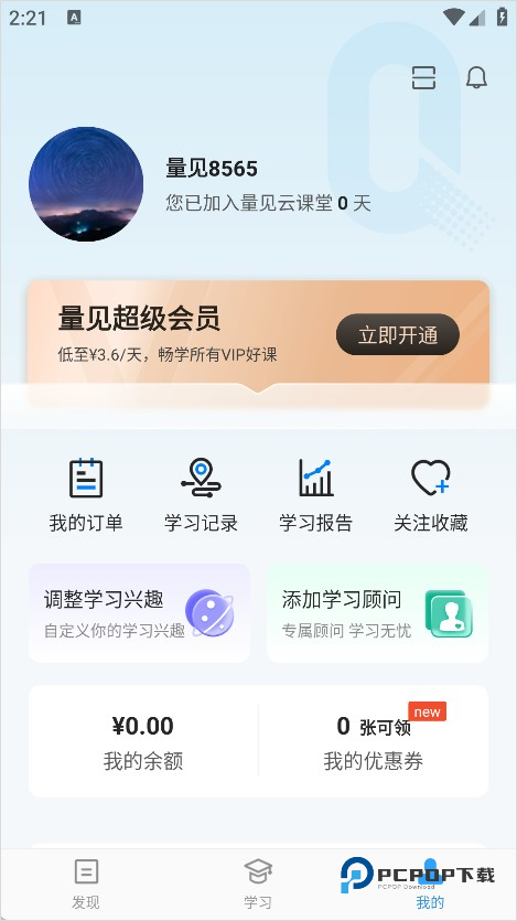 4、最后,关于“我的”,在这里你可以查看自己的购买课程内容,也可以查询自己的余额,亦或者添加学习顾问,设置个人偏好。