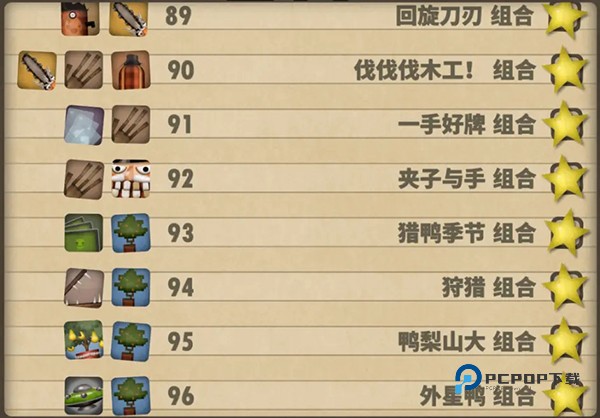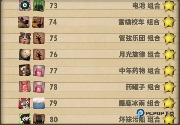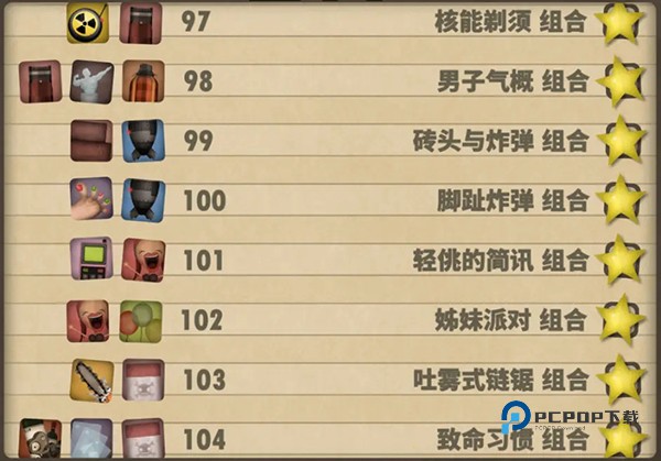 十、73—80组合:喷云吐雾链条组合:Drill Chain Thrower(6) PuffPack(6);致命恶习组合:Midlife Crisis Mitigator(3) Glass Cards(6) Puff Pack(6);注射组合:Snake Surprise(2) Protein Powder(6);健美组合:Manly Trophy(6) Protein Powder(6);震耳欲聋的组合:Valkyrie Doll (2) Sonic Boombox(6);狂飙组合:Wooden Bicycle(1) Celebration Bus(1) Mustache Rider(6);患病的组合:Toy Leperchaun(2) Mystery Seasoning(3) Book of Darkness(6)