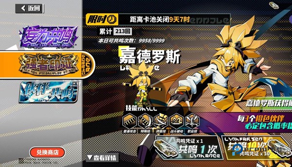 2、但专属卡池会随着周期更换,有的玩家在周期内没有获得想要的金卡角色,又不想去普通卡池和合成碎片碰运气;那就要提到在共鸣再造中我们可以兑换信物来合成我们想要的角色,以此弥补没有在卡池中获得的缺憾了。