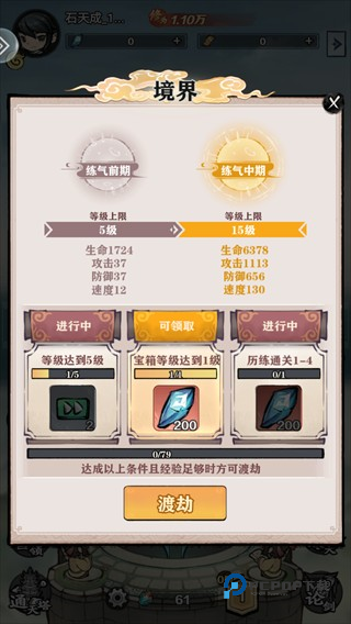 从练气前期开始,玩家可通过完成等级任务、宝箱收集及历练等条件,逐步突破更高境界,每次渡劫都将带来属性的大幅提升,让角色更加强大。