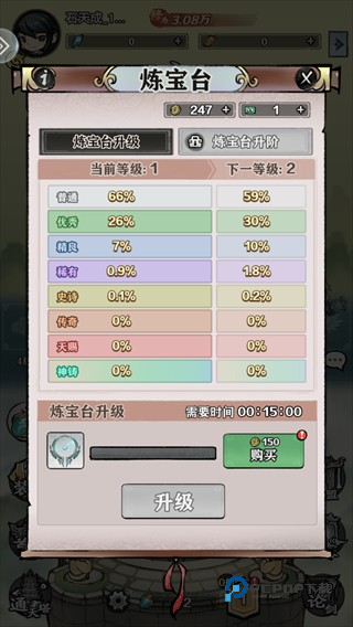 玩家可通过炼宝台产出各类装备,品质从普通到神铸不等。提升炼宝台等级可显著增加高品质装备的掉落概率。