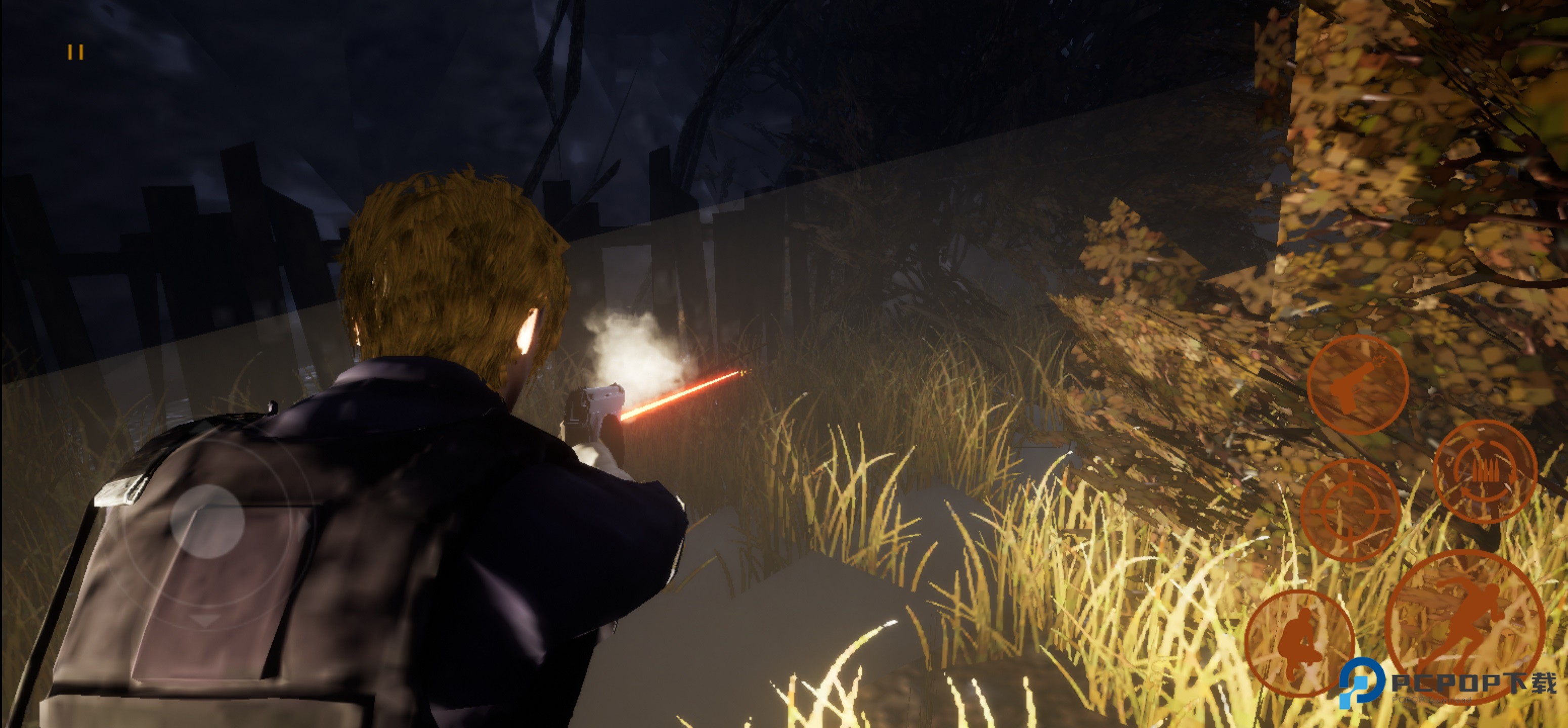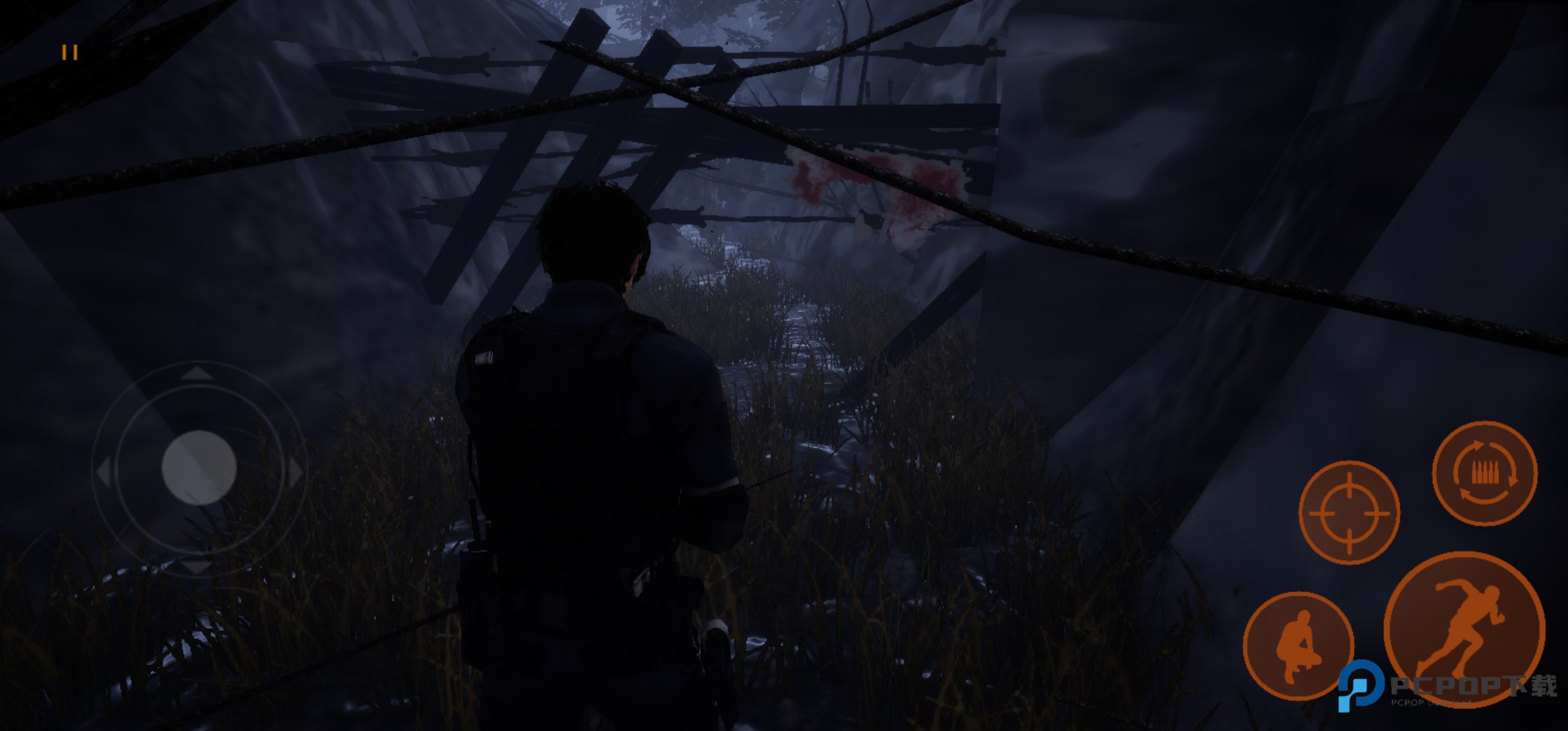 2、游戏开始,玩家可以通过屏幕左侧控制角色的移动,屏幕右侧控制角色的瞄准射击,奔跑,换弹等等操作,了解完基础操作,就可以沿着小路向前直行了。