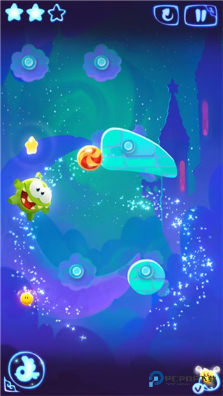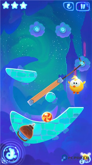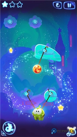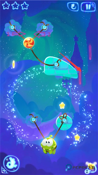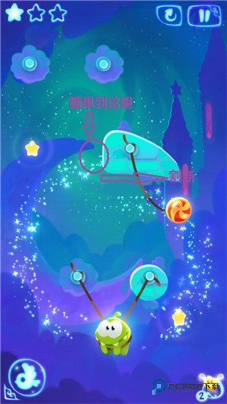 当糖果获得第一颗星星的时候将绳子割断,糖果便可顺着星河达到指定位置。