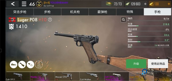 lugerP08是VE日更新的武器,当时不怎么起眼,现在版本成为了神器,满级伤害有230多左右,外加轻便的移速再配合狙击手手40%伤害加成,可以让这把武器能够在大佬的林弹雨间来回穿梭,是非常好的武器