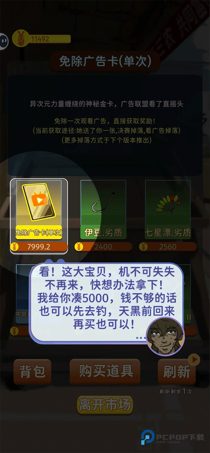 钓完了6次鱼会弹出事件按钮,不要点击,否则会自动进入下一天,我们点击左上角《返回营地》,然后进入商店,NPC会赠送我们5000鱼币,加上自身钓的3000+鱼币,就可以购买免广卡。