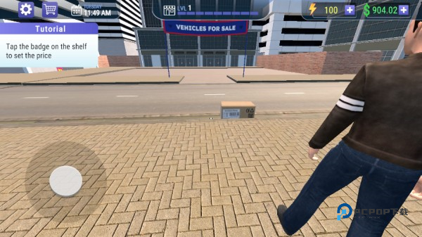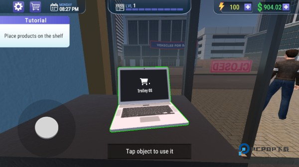 1、进入游戏,通过虚拟盘控制人物移动,滑动屏幕任意位置可切换视角,游戏内通过了一台电脑用以购入设备;