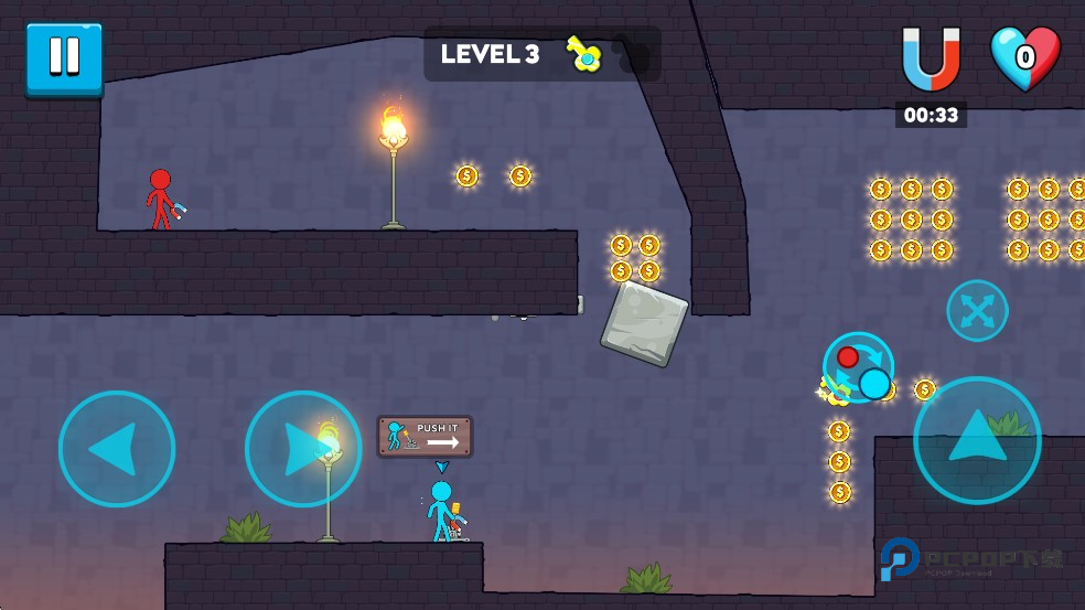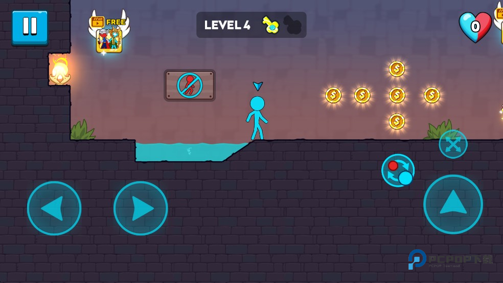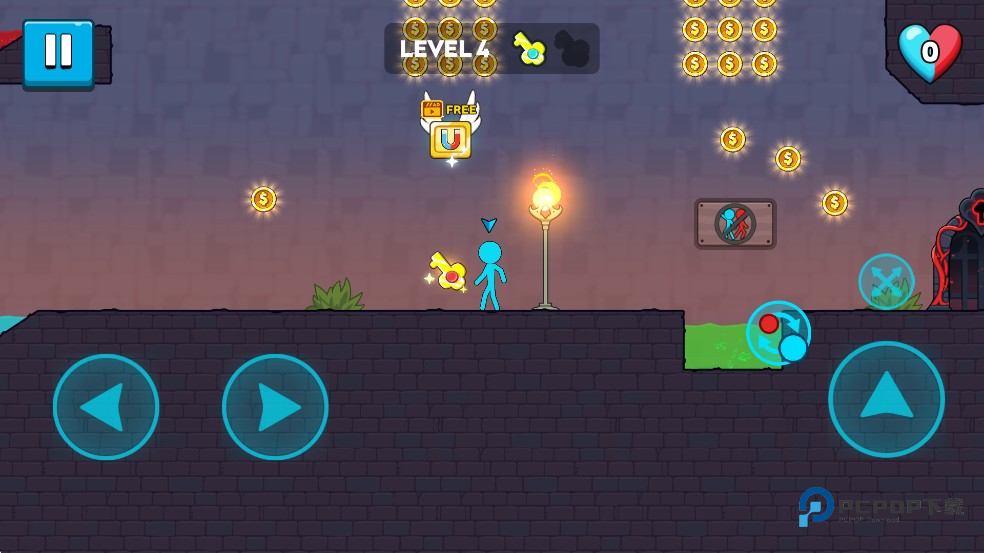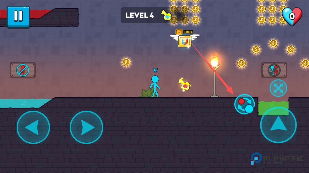 2、进入游戏后你需要一个人控制2个角色,分别是冰火柴人和火火柴人