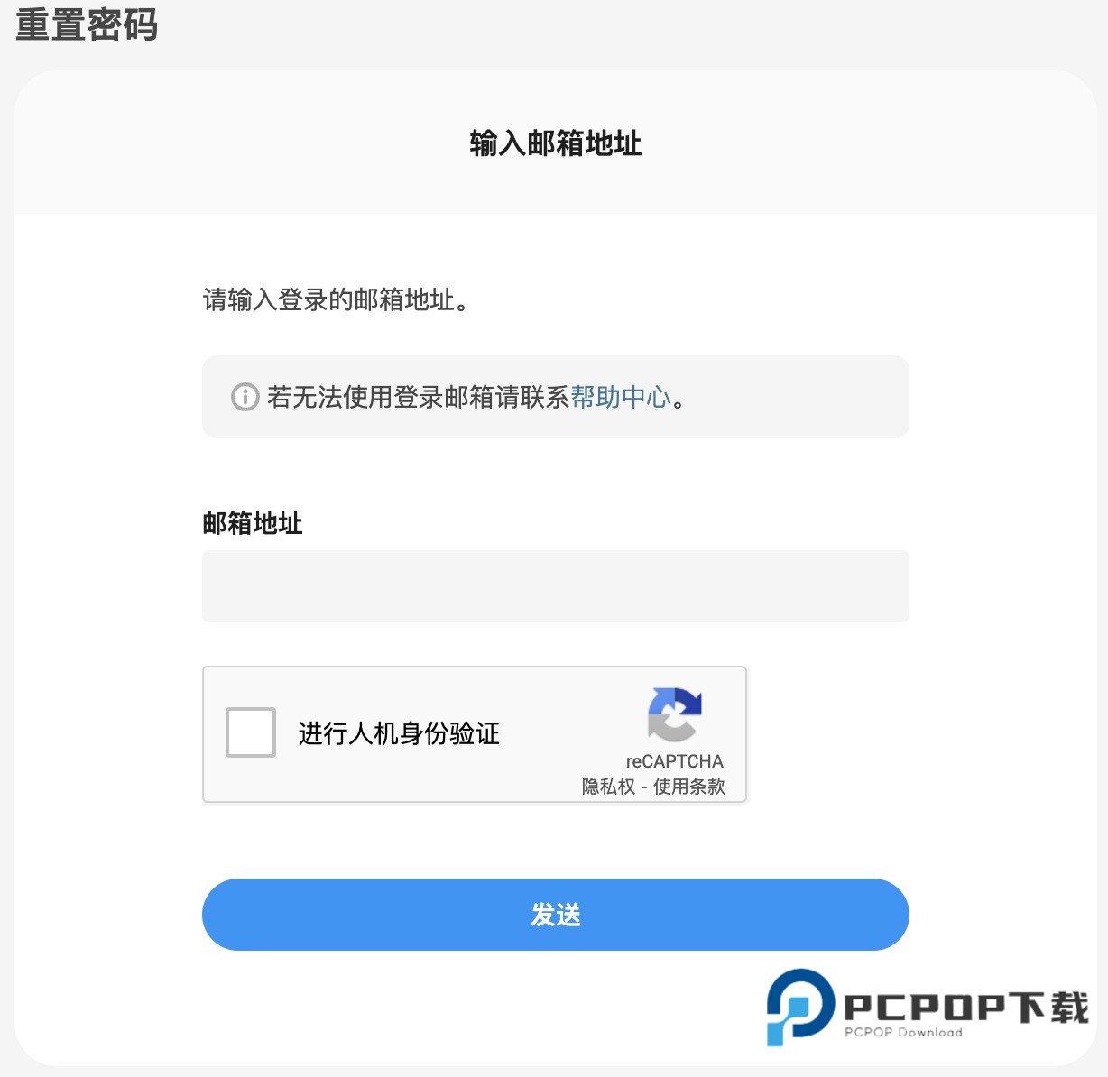 1、在重置密码页面的邮箱地址栏输入邮箱地址,勾选「进行人机身份验证」后点击「发送」按钮。