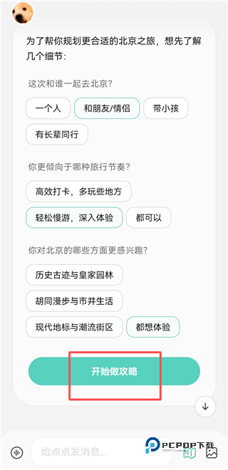 3、在点点进行思考后,会问你旅行的细节,根据自己等情况回答即可,然后点击【开始做攻略】。